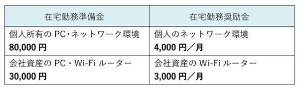 具体的には、6カ月以上継続して常時在宅勤務を行う社員を対象に、PC・ネットワークなど勤務環境の整備にかかわる準備金を初回のみ支給する。個人所有のPCやネットワークを利用する社員には8万円、会社資産のPCまたはWi-Fiルータを利用する社員には3万円を支給する。また、常時在宅勤務者を対象に電気代・通信費などの手当てを在宅勤務奨励金として支給する。