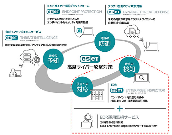 EDR運用監視サービスは、インシデント発生時の速やかな状況把握と被害の最小化を目的とした顧客のインシデントハンドリングを支援するサービス。ITセキュリティに特化したコンサルティングや脆弱性診断などのサービスを展開するブロードバンドセキュリティ(BBSec、持塚朗社長)との協業により、高い検出力と低い誤検知率をもつESETのEDR製品EEIの運用監視サービスを年額2300円から提供する。