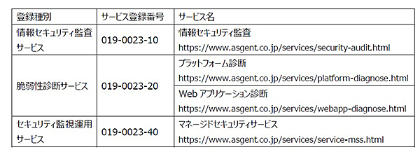 今回、情報セキュリティサービス基準適合サービスリストに登録されたアズジェントのサービスは、「情報セキュリティ監査」(登録種別:情報セキュリティ監査サービス)、「プラットフォーム診断」(登録種別:脆弱性診断サービス)、「Webアプリケーション診断」(登録種別:脆弱性診断サービス)、「マネージドセキュリティサービス」(登録種別:セキュリティ監視運用サービス)の3種4サービスとなる。