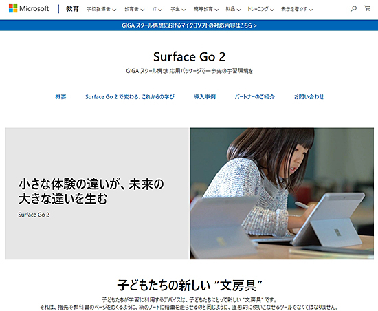 Surface Go 2は、文部科学省が「GIGAスクール構想」で示している「学習者用端末の標準仕様」をすべて満たすとともに、さまざまなデジタル教材の活用に十分耐えうる性能、ペン描画機能、高精細の両側カメラなど、これからの子どもたちに必要な機能を備えた、GIGAスクール構想「応用パッケージ」に最適なデバイス。日本マイクロソフトでは、5月12日にSurface Go 2の提供を開始している。