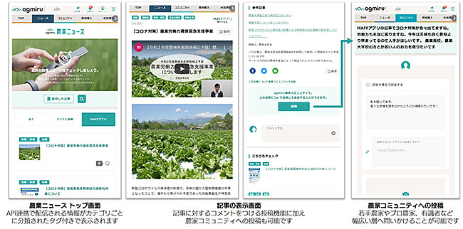 今回の連携によって、agmiruユーザーはagmiru農業ニュース内でリアルタイムに情報を得ることができる。また、その記事についてユーザー同士でコメントしあったり、agmiruのコミュニティサービスで若手農家やプロ農家、有識者などへ幅広く問いかけることで、情報に対する理解をさらに深めることが可能となる。