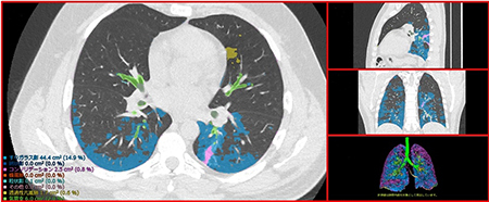 富士フイルムの間質性肺炎の定量化技術は、AI技術を用いて設計したソフトウェアが、CT画像から肺野内の気管支、血管、正常肺、網状影やすりガラス影、蜂巣肺など肺の7種類の病変性状を識別し、自動で分類・測定することで、間質性肺炎の病変を定量化するもの。さらに、肺野内の病変の分布と進行状態を詳細に確認できるよう、肺野を12の領域に分割し、その領域ごとに、病変の容積と割合を表示する。