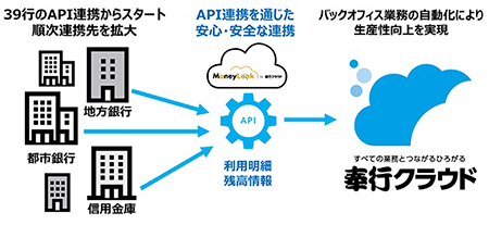 18年6月1日に施行された改正銀行法により、電子決済等代行業者は金融機関とのAPI連携を通じた安心・安全な連携が求められている。これにともない奉行クラウドは、API連携の基盤としてSBIビジネス・ソリューションズ(夏川雅貴社長)が提供する「MoneyLook for 奉行クラウド」を活用し、金融機関とのAPI連携を実現した。