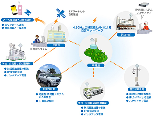 自営ネットワークの構築では、自治体の指定する避難所を無線LAN機器で結び高速な双方向通信ができ、安定した通信を実現する。また、IP電話網を整備すれば、災害時に安否確認などによる電話回線の混み合いによる影響を受けることがない。IP告知システムを用いることで、学校や公民館など避難所の放送設備とも連携し、緊急放送を広範囲に伝えることも可能。さらに、海岸、土砂災害警戒区域などの危険箇所にネットワークカメラを設置することで、ネットワーク経由で役所の災害対策室で確認するなどの用途でも活用できる。