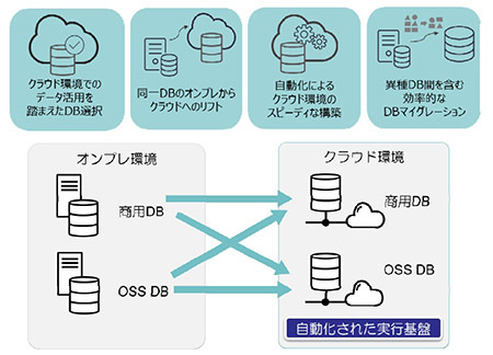 クラウド・データベース・マイグレーション・サービスは、クラウド環境のグランドデザインからデータベースの選択・移行を、コストを抑え確実・スピーディーに実現するサービス。クラウドへのリフト、バージョンアップ、さらには異種データベース間マイグレーションまで、クラウド化にともない想定されるあらゆるシーンに対し、自動化された実行基盤上への構築とスムーズな移行プロセスの標準化により、クラウド環境のメリットを最大限に享受できる環境を実現する。
