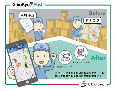 CBcloudが提供する宅配事業者向けの業務効率化システムSmaRyuPostは、6月15日を皮切りに10月までに順次全国約200局の郵便局に導入される。SmaRyuPostでは、配送現場の大きな課題であるアナログで非効率な業務を解決することを目的に、スマートフォン上で荷積み・配送ルーティング/ナビゲーション・配送ステータス管理・電子サインなど一連の機能を一気通貫で提供する。経路・荷姿を考慮した車内の荷積み位置指定や配達先との個別事情や関係性など、熟練ドライバーのノウハウを継承する機能を搭載しており、初心者のドライバーや担当者でも滞りなく業務を行えるよう支援する。