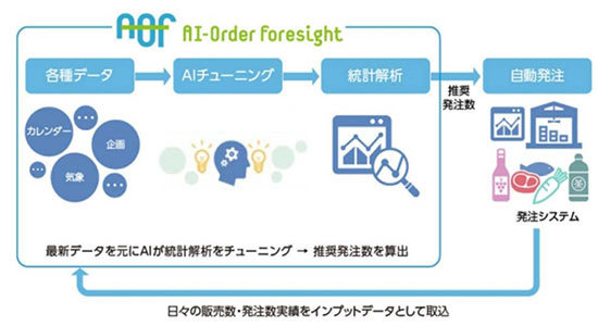 AIOrder Foresightは、販売実績・気象情報・企画情報などの各種データを元に、小売店舗で日々算出が必要な商品発注数を自動決定するサービス。作業負荷・難易度の高い発注業務を自動化することで、昨今の社会課題である労働力不足を解決し、要員の経験やスキルに依存しない店舗運営・機会ロス・廃棄ロス削減を実現する。