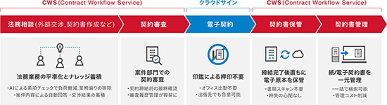 今回共同開発する「クラウドサイン連携オプション」では、法務相談と紙文書の契約情報管理に加え、電子締結・電子契約書管理までの法務業務全般の支援が可能となる。押印と契約書の保管・登録のプロセスを電子化することで、出張時や在宅勤務時でもモバイルパソコンやスマートフォンから締結処理を行えるようになる。また、紙文書をスキャンする手間がなく、締結完了後に電子原本を自動で保管するため、郵送物遺失のリスクやオフィスでの書類管理作業が不要になる。契約業務の大幅な削減や、契約締結のスピード化とコスト削減を支援する。