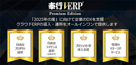 奉行V ERP Premium Editionは、「2025年の崖」問題を含め企業に求められるDX対応への支援と、クラウドERPパッケージ「奉行V ERP」の導入・運用をオールインワンサービスにして提供するもの。環境構築から導入支援・教育、運用管理などのフルサポート体制のもと基幹システムの導入・運用を実現し、短期間で基幹システムを移行することで、DXを成功させたい企業をサポートする。