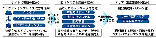各「面」は、場所の区分である3種類の「サイト」(メインデータセンター、BCPデータセンター、クラウド)を横断して接続している。これにより、稼働させるアプリケーションの性質に応じて、オンプレミス・クラウドから最適なインフラを選択可能にした。