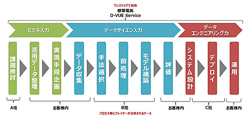 D-VUE Serviceは、同社が保有するAIや統計の知見に基づき、顧客のビジネス課題につながるデータ分析と、分析結果の「見える化」をワンストップで行うサービス。デジタル技術の活用(データ収集、分析、分析結果を踏まえたAIシステム導入)の全プロセスを提供し、課題の検討からシステム構築まで、一貫した対応が可能となっている。