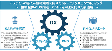 同サービスでは、エンタープライズアジャイルの領域でトップシェアの大規模アジャイル開発フレームワーク「SAFe(Scaled Agile Framework)」を活用し、これにTISでの大規模開発の経験と「PMO支援サービス」のノウハウを融合することで、アジャイル開発の成功率の向上と企業の機敏性の改善をサポートする。