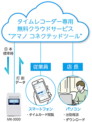 アマノ コネクテッドツールは、タイムレコーダーの新しい利用シーンを提供する利用料無料のタイムレコーダー専用クラウドサービス。同サービスに対応したコネクテッドタイムレコーダーで打刻された記録を専用のクラウドサーバーに自動保存し、どこからでもインターネット経由で、リアルタイムにタイムカードの打刻記録を確認することができる。例えば店舗で使用する場合、店長が自宅や外出先からリモ-トで、アルバイトの出勤状況をリアルタイムに確認できる。また、店長の許可により各従業員がスマートフォンで自分の勤務記録(タイムカード)を閲覧することもできる。