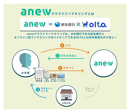 一方、anewは、OLTAが有するAIを活用した審査ノウハウと新生銀行の資金力を組み合わせたオンライン完結型のanewクラウドファクタリングを通じて、従来の金融機関では十分サポートされていない数百万円から1000万円程度の資金ニーズに対応し、資金繰りの悩みを抱える中小企業・小規模事業者に新しい資金調達の選択肢を提供している。