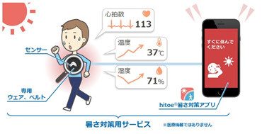 また、NTTテクノクロスが開発した専用アプリケーション「hitoe暑さ対策アプリ」を活用することで、計測された体調の変化や温度や湿度による熱ストレス、運動負荷などのデータから体調不良の予兆をシャツ型センサーの着用者に通知する。さらに、活動しながらスマートフォンなどでデータをチェックすることで、休憩タイミングの目安にもなり、早期対策につなげることができる。