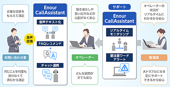 Enour CallAssistantは、顧客とオペレーターの会話内容をリアルタイムにテキスト化し、顧客からの質問に対して適切な回答をレコメンドする。そのため、新人オペレーターでも安心して応対が可能となる。また、会話終了後には応対内容を自動的に要約する機能を備えており、後処理時間の削減が期待できる。さらには、管理者がリアルタイムに会話内容をモニタリングできる機能やマーケティング・商品改善部門の担当者がVoC分析のために会話内容を抽出できるレポート機能も搭載している。