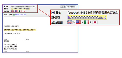国別経路情報表示機能では、Received Headerの情報からメールが経由してきたサーバーのIPアドレスを抜き出して国旗で表示する。なりすましや標的型攻撃メールは攻撃の足跡を残さないよう複数の国を経由して着弾することが多いため、誰でも一目でわかる“国旗”によって可視化することで、ユーザーのITリテラシーに依存せず怪しいメールであるかどうかの気づきを促すことができる。