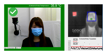 サーマルカメラの前に立つだけで、非接触で瞬時に体温を確認できる。具体的には、サーマルカメラでの検温結果がタブレットPCに表示され、平熱の場合(例:37.5度未満)は問題ないことを表示し、発熱時は警告音を発する。一定の温度を発する基準熱源を利用することで、検温誤差を±0.3度程度に抑えている。