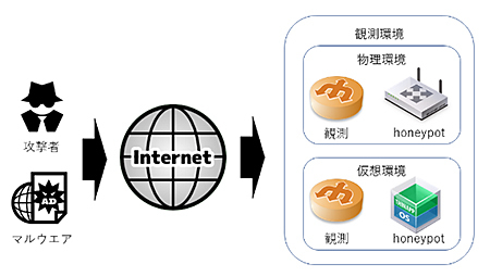 インターネット上の不正行為によって発生する情報漏えいやシステムへの攻撃によるダメージ発生などの対策として、不正行為の検知や攻撃観測などを行うために、ハニーポット環境を用意して検知し脅威対策データとしている。しかし、攻撃パターンの複雑化や生存期間の短いマルウェアの出現などで、従来のハニーポットシステムでは、検知できない脅威が増えている。
