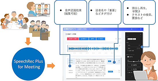 新製品は、NTT研究所の世界最高レベルの音声認識AIをベースに開発した高精度音声認識ソフトウェア「SpeechRec」を議事録作成に最適化したもの。長い発話や専門用語の自動書き起こしを可能にすることで、議事録作成の効率化を実現する。