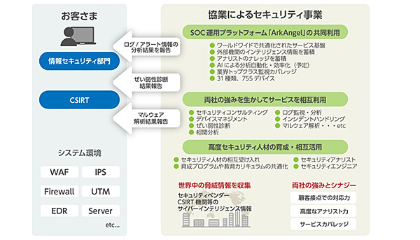 また、両社は強力なパートナーシップによって、セキュリティインシデントの事前対策として、セキュリティ監視やセキュリティデバイスマネジメント、ぜい弱性診断、セキュリティコンサルティングを提供するほか、セキュリティインシデントの事後対策として、セキュリティインシデントハンドリング、マルウェア解析、インシデントレスポンスなどのサービスを相互活用し、高品質なセキュリティサービスを提供していく。