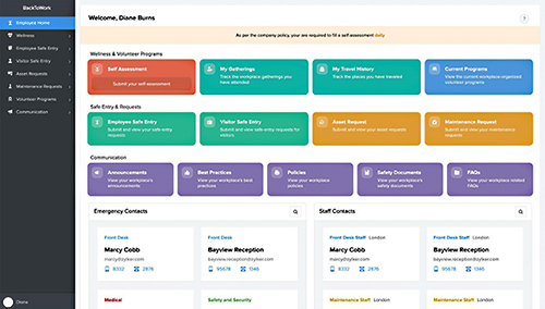 「健康管理」では、従業員全員に自己診断フォームと接触者追跡フォームを配布して回収し、健康状態に関する組織全体の情報を監視する。この機能では、業界標準のアンケート形式を採用しており、組織は会社のポリシーに基づいて、従業員を対象としたアンケート調査を実施する頻度を決定できる。