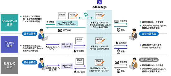 Adobe Sign導入支援サービスでは、その知見を活用し、Adobe Signの導入に加えて、Microsoft Teamsをインターフェースにしたシームレスな環境構築やMicrosoft SharePoint Onlineと連携したワークフロー構築などを提供する。