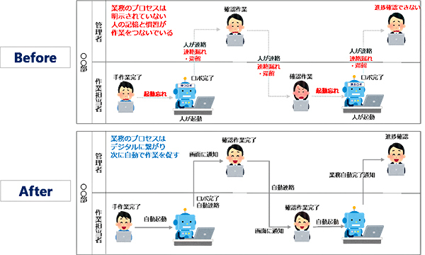 共同開発したロボポータルは、人とRPAの作業をシームレスにつなぎ、End to Endの業務プロセスを円滑にすることで、業務全般の効率化・自動化を実現する。RPA含めた業務の実行ステータス・進捗状況、自身の作業がリモートで確認できるため、場所を選ばずスピーディーな業務遂行が可能となる。また、作業の停滞やRPAのエラーをビジュアルに確認することもできる。
