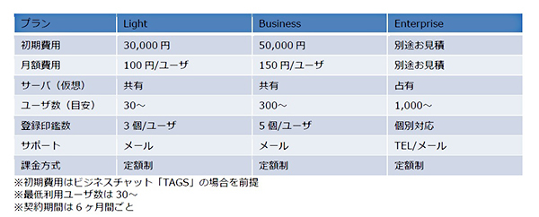 税別価格は、Lightプランが初期費用3万円、月額費用100円/ユーザー、Businessプランが初期費用5万円、月額費用150円/ユーザー、Enterpriseプランは別途見積もりとなる。また、有償オプションとして、TAGS以外のチャットサービスとの連携を支援する「API連携支援」と、開発から導入までワンストップで提供する「個別開発」を用意している。なお、新型コロナ対策応援キャンペーンとして、12月までに申し込んだ場合、初期費用が無料となる。