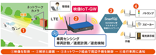 具体的には、「トラフィックカウント」「速度検知」「逆走探知」「IoT機器連携」「映像圧縮・録画」の5つの機能により、エッジ領域でのリアルタイムな車両センシングを実現した。AIエッジコンピューターでディープラーニング画像解析を行うことで、夜間や降雨雪時などの悪条件な環境下での認識精度向上を図っている。さらに、LTEや920MHz帯マルチホップ無線(SmartHop)などの各種インターフェースに対応することで、柔軟な設置環境や各種IoT機器との連携を実現。また、AIの知識がない人でも扱える簡単な設定機能を備えた車両センシングアプリケーションをパッケージ化することで、高度なディープラーニングAIシステムでありながら、簡単な設定・導入を可能にした。
