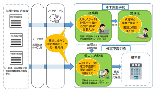 マイナポータル連携サービスにより、各生命保険会社の契約者は、年末調整手続きや所得税確定申告手続きに関して、マイナポータルを利用して控除証明書データを一括取得し、そのデータを保険料控除申告書や確定申告書に自動入力することが可能となる。従来ハガキなどの書面で行っていた年末調整手続きや所得税確定申告手続きが簡便になるほか、申告に必要な時期までの書類の保管が不要となる。