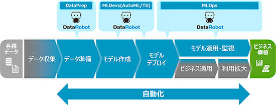 今回、販売代理店契約を更新したことで、DataRobotの幅広いライセンス販売が可能となった。具体的には、AIによる予測モデルを自動生成する大規模向けライセンス「DataRobot Enterprise」と中堅・中小企業向けにスモールスタートを実現できる「DataRobot Starter」をベースに、機械学習に投入するデータの準備・加工を実施する「DataRobot Data Prep」や予測モデル構築後の運用・監視を行う「DataRobot MLOps」などを合わせて提供することで、顧客の業務改善を支援する。