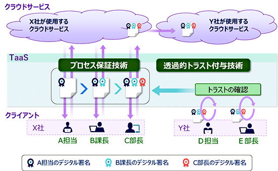 具体的には、クラウドサービスとクライアント端末(サービス利用者)間のクラウド環境に、同社独自開発のTrust as a Service(TaaS)層を設置。クライアント端末に代わって署名が必要なデータに対して自動的にデジタル署名を実行し、真正性を透過的に付与することができる。また、サービス利用者の手間をなくしつつ、クラウドサービスからTaaS層、クライアント端末までを安全に接続・仲介するためのTaaS向け認証プロトコルを開発した。
