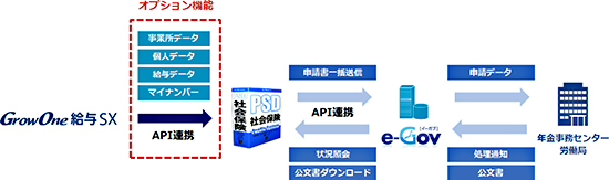 今回販売を開始するオプション機能によって、e-GovとAPI連携可能なパシフィックシステムのPSD労働社会保険と、ニッセイコムのGrowOne 給与SXを連携することで人事・総務部門の社会保険申請にかかる業務の効率を向上することが可能となる。