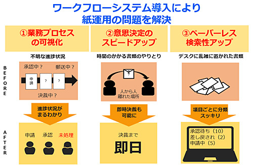 新型コロナウイルスによって、企業も行政も多くの転換を求められている。今までは来庁して手続きを行うことが通常だったが、三密回避の観点からも、遠隔から申請などを受け付ける必要性が高まっている。また、職員の健康と安全を守りながら、安定した行政サービスを提供するためにも、行政内の業務、とくに稟議や申請・承認業務に関してのデジタル化は必要となると予測される。合わせて、紙からの脱却により、業務を整理して効率化を図ることが可能となるほか、行政に変革が起きれば企業の変革の流れもさらに加速すると考えられている。