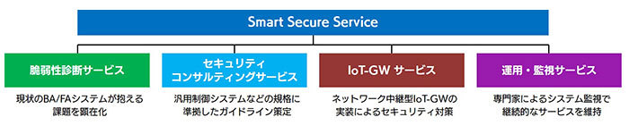 Smart Secure Serviceは、脆弱性診断サービスやセキュリティコンサルティングサービス、IoT-GWサービスと運用・監視サービスを組み合わせて、建物のスマート化によってより高いセキュリティ性能が求められる建物設備のライフサイクルにあわせて幅広いセキュリティ対策を提供するサービス。これにより、効率的な管理と高度な機能が求められるSociety 5.0時代のスマートビルやスマートファクトリーの普及を支援する。