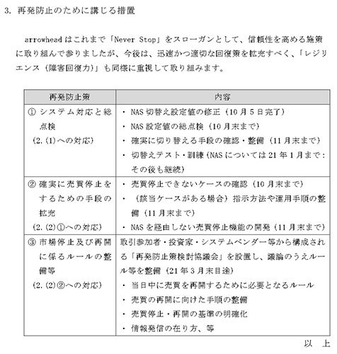 今回の障害はNASの自動切り替えが動作しなかったことに原因があるが、その後の対応でNAS2号機へ手動で切り替えることでシステムは正常に動作するようになっている。それにもかかわらず終日の売買停止を決断するに至ったのは、再開するための対策が不十分だったからだとしている。9時からの売買停止の際、通常は社内の売買管理画面から操作する必要があったが、その際に同機能がNASにアクセスする処理を行っていたことから別の停止手段としてネットワークの切断を選択。しかし、arrowhead内部ではネットワーク切断までに受けていた処理が動き続けており、売買再開に向けた手順や確認項目が増えてしまった。