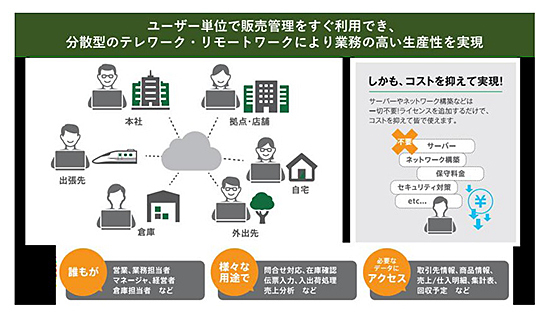 アフターコロナでも多様な働き方に対応するため、従業員それぞれの役割に応じて働きやすい環境を容易に構築できる。サーバー不要でユーザー単位ですぐに利用でき、分散型のテレワーク・リモートワークにより業務の生産性向上を実現する。また、受注・売り上げや在庫などの情報はクラウド上で即時共有され、従来のようなデータ共有の業務は不要となる。さらに、Excel連携やグラフ化、様々なサービスとのAPI連携などでユーザーがいつでも・どこでもデータを利用できる。セキュリティについても、マイクロソフトのテクノロジーによってネイティブに開発・運用され、通信はすべて暗号化で安全に保護している。これにより、すべての企業で世界レベルのセキュリティレベルで新しい働き方を実現できる。