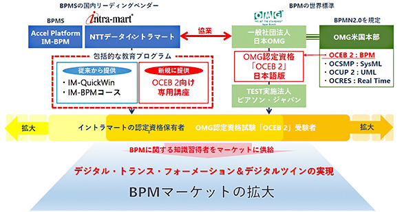 イントラマートは、システム共通基盤「intra-mart」を主軸に業務プロセス全体のデジタル化・自動化による企業の生産性の向上で豊富な実績をもっている。今回の協業では、日本OMGによる資格認定試験「OCEB 2」日本語版の提供にともない、受験者向けに試験対策となる独自の専用講座をはじめ、イントラマートの研修プログラム「IM-BPMコース」や企業のDX(デジタル・トランスフォーメーション)推進を支援するDXアプローチメソッド「IM-QuickWin」と連動した総合的なBPM(Business Process Modeling)の教育プログラムを提供する。