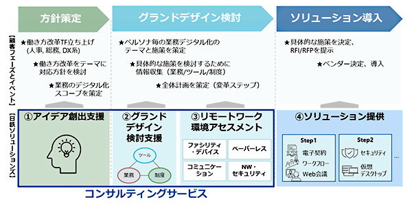 今回提供するのは、「アイデア創出支援」「グランドデザイン検討」「リモートワーク環境アセスメント」の3つのコンサルティングサービス。