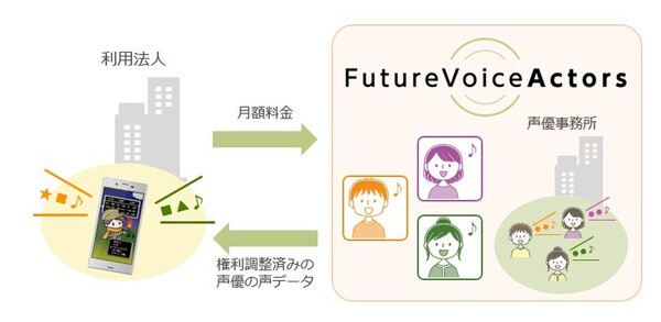 また、これまで声優の声を法人のサービスとして利用するためには、声優事務所との権利交渉に多くの時間を要することから、利用企業にとって大きな負担となっていた。新サービスでは、基本的な権利要項について調整済みの声優の合成音声を提供するため、権利の調整を一部の確認事項のみにでき、手間をかけずに声優の声を利用することが可能となる。