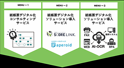 具体的には、「紙帳票デジタル化コンサルティングサービス」「紙帳票デジタル化ソリューション導入サービス」「帳票デジタル化システムインテグレーションサービス」の3つのサービスメニューにより、紙帳票業務を自動化・効率化する。