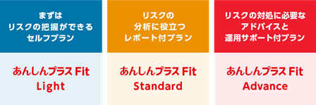 「セキュリティ対策を見直したいが何から始めればよいかわからない」「セキュリティ専任者がいないので運用できていない」などの悩みを抱えている中堅・中小企業向けに、顧客の運用体制にフィット(Fit)するサービスをパッケージングし、まずは「Light」「Standard」「Advance」の3つのプランから提供する。Lightは、リスクの把握ができるセルフプラン。Standardは、リスクの分析に役立つレポート付プラン。Advanceは、リスクの対処に必要なアドバイスと運用サポート付プランとなる。