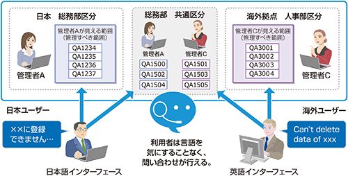 例えば、日本の本社ではシステム全体の管理と日本語のQ&A管理を行い、日本語以外の言語を使用している海外拠点については、拠点ごとの言語による問い合わせ対応、Q&Aデータの管理といった運用が可能となる。