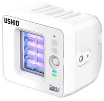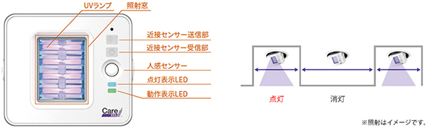 新製品の特徴は、有人環境でも紫外線を照射できるだけでなく、人感センサーを内蔵し無人環境下でのみ照射できるモードや消灯を自動化できる。米国・産業衛生専門官会議で定められたUV照射に関する安全ガイドラインに従った照射量のコントロールが可能だという。