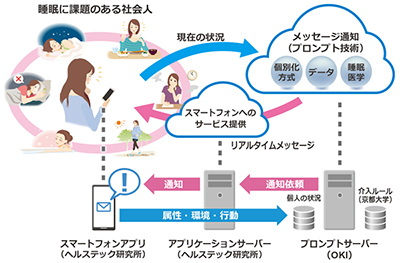 OKIでは、日常の生活サイクルの中でユーザーの状況を検出し、個人の行動に合わせて適切なタイミングで適切なメッセージをリアルタイムに通知することでヒトの意識や行動を変化させる行動変容システム(プロンプト技術)を開発してきた。今回、京都大学の知見を基に作成した不眠症改善に適した介入ルールをデータベース化し、ヘルステック研究所が開発しているスマートフォンアプリにプロンプト技術を搭載。これを睡眠改善ソリューションションとして発表した。