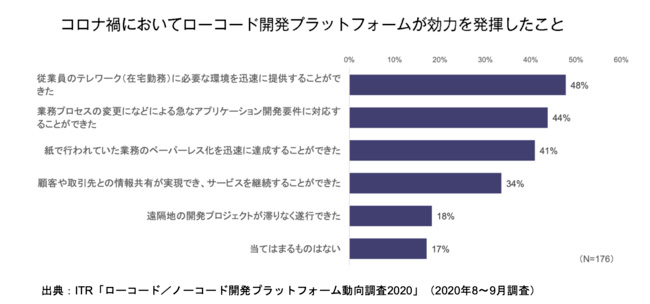 実際にローコード開発プラットフォームを導入・利用したことにより、急な業務環境変化にも迅速に対応できたという回答が約半数となった。同プラットフォームは、クラウドが普及してシステム・リソース上の制約が大幅に低減した現在、柔軟性の高いシステム環境を迅速に構築しようとする企業のニーズに応えるべく登場した新しいタイプのシステム開発/実行環境であるといえる。