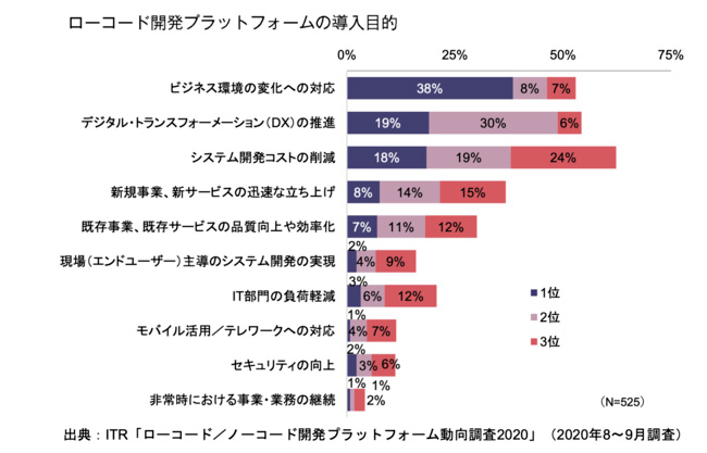 ローコード開発プラットフォームを導入する目的について、最も重要視されていたのは「ビジネス環境の変化への対応」となった。この結果からもローコード開発がビジネスへの貢献を強く意識して導入されていることがわかる。IT部門と業務部門が一体となったアプリケーション戦略を手にすることはDX推進を成功に導くうえで、強力な後押しになると考えられる。