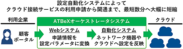 今回構築したATBeXオーケストレータシステムでは、サービス利用企業の申請内容をネットワーク機器やクラウドサービスの設定パラメータに自動的に変換。変換された設定パラメータをネットワーク機器やクラウドサービスへ自動的に反映する。これにより、利用企業からの利用申請からクラウドサービスへの接続設定を自動化し、開通処理に必要な期間を従来の2営業日から最短数分へと大幅に短縮した。
