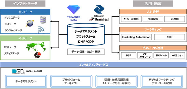また、「カスタマーエクスペリエンス」や「顧客ロイヤリティ」といった顧客個人を軸としたデジタルマーケティングを行うためのデータマネジメントプラットフォームを提供する。さらに、豊富なデータ統合・連携の構築実績をベースとしたノウハウを用いてプラットフォーム上でのデータ統合を促進し、インプットデータの取り込みからアウトプットデータの抽出、その利活用、マーケティング施策への連携までトータルで支援する。トレジャーデータとブレインパッドと協業し、データマネジメントプラットフォーム導入とマーケティング施策実施の伴走・定着支援によりカスタマーサクセスを提供する。